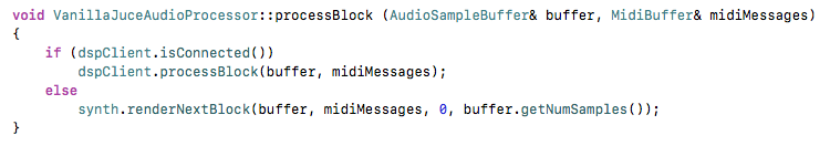 - For the plug-in itself, the existing PluginProcessor-derived class receives a new DSPClient member, and its processBlock() function is modified to allow the option either run locally as usual, or remotely by delegating to the DSPClient's processBlock() function: