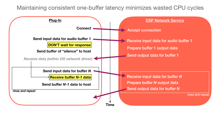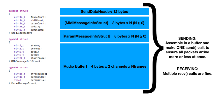 Issuing multiple send() calls can cause longer inter-packet delays, leading to some recv() calls having to block and wait. This is manifested in high apparent CPU usage for the plug-in (due to blocking calls on the render thread) and, quite often, choppy audio.
