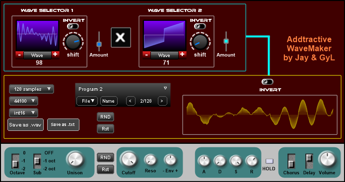 - the created wave can be saved as .txt or .wav, the sample quantity can be 128...2048 (the txt stops at 1024), 44.1 or 48 kHz and 16, 24 or 32 bit