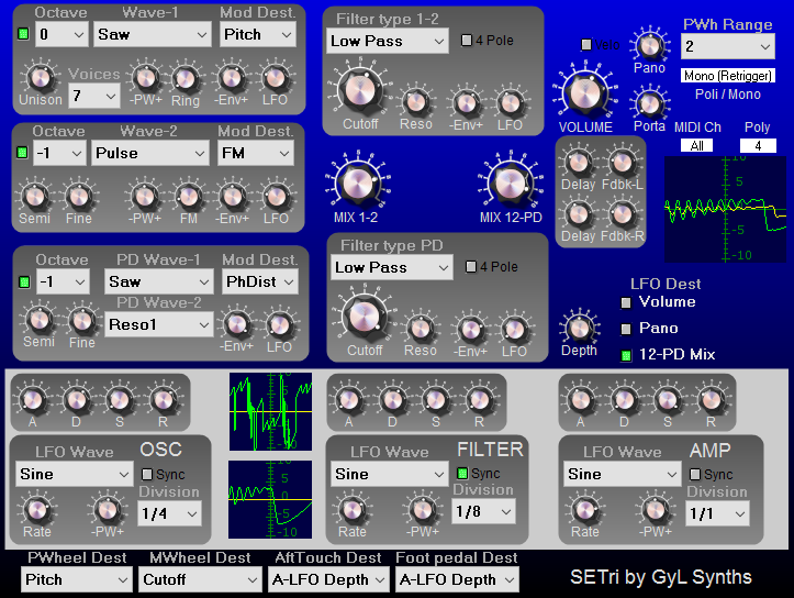 - 3 oscillators - an unison multi waveform, a detunable multi waveform and a detunable Phase Distortion osc