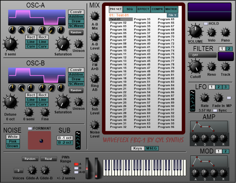 - 4 octaves keyboard with mod- and pitchwheel (adjustable range), independent glide for A and B oscs
