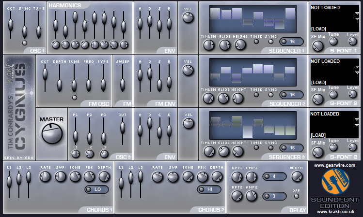 Another version of Cygnus, with the extra functionality of being able to load Soundfonts ito each of the 3 oscillator locations, this feature coming about due to the plug-ins coverage at GearWire.com.
