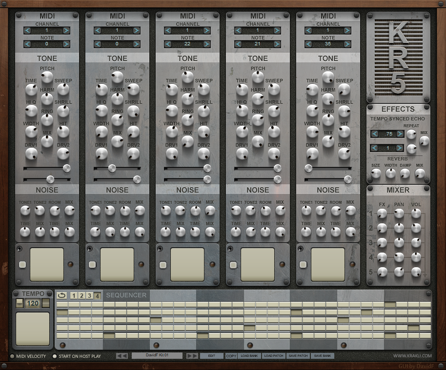 For the first time ever Krakli has created a drum machine. Triggered by its own sequencer or via MDI or just played via the pads KR5 has 5 channels of flexible drum synthesis, Don't expect TR909 or 808 clones here, it is Krakli after all!