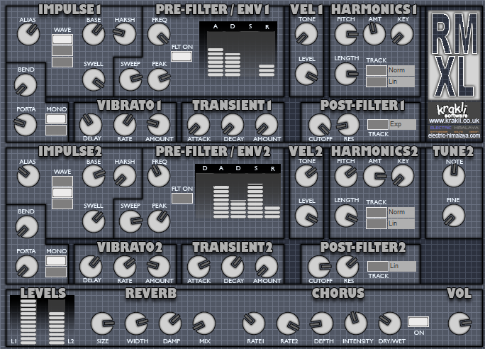 Like RichmanCM, RMXL has some special features including the fact that each sound generating 'line' is totally independent meaning that they can have their own portamento, Glide or Mono/poly settings. Some of Himalaya's patches show the mixed Mono & poly mode off to a very good advantage. Other improvements include Envelope modulation of the pre-filters and a much wider tuning range for line two.