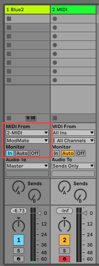 What you need to do is to put ModMate onto a MIDI track all by itself, and then set the MIDI From menus of your instrument tracks (i.e., your Omnisphere 2 MIDI tracks) to receive MIDI from ModMate. I also found that I had to set my instrument track’s Monitor setting to “In” (not “Auto”) or I didn’t hear any sound.