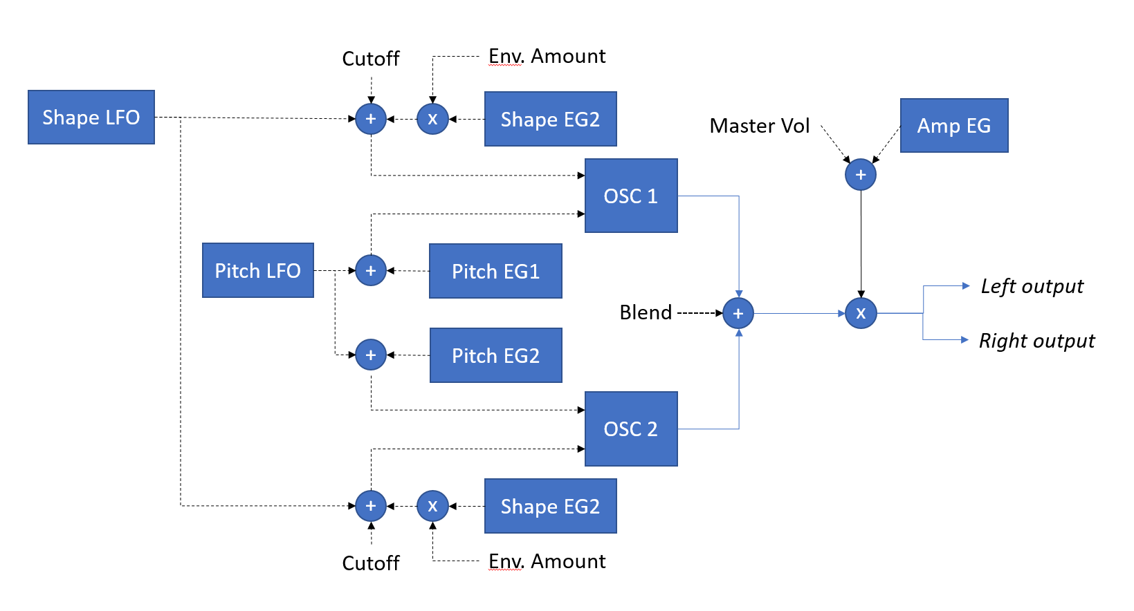 The OSC1 and OSC2 outputs are mixed according to the “Blend” setting. The mixed output is scaled by the sum of the Amp EG output, plus the “Master volume” setting, and split out evenly (no panning) to the Left and Right audio outputs.